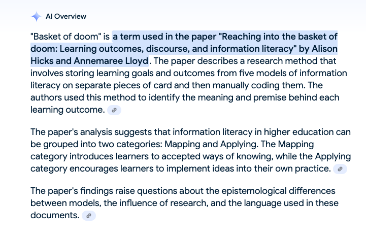 What McInnis didn’t live to see and probably didn’t foresee is the way in which, thanks to large language models, “discourse synthesis” has now become a goal of many artificial intelligence applications in education and beyond, while their involvement in various “discursive communities” is already underway (for instance, this interview with ChatGPT on the future of journalism in Editor & Publisher). Right this way to the Crater of Doom in Human Understanding, folks! (Or, in Hicks and Lloyd’s terminology, to “the basket of doom” in information literacy, as “explained” below in Google’s AI overview just now):